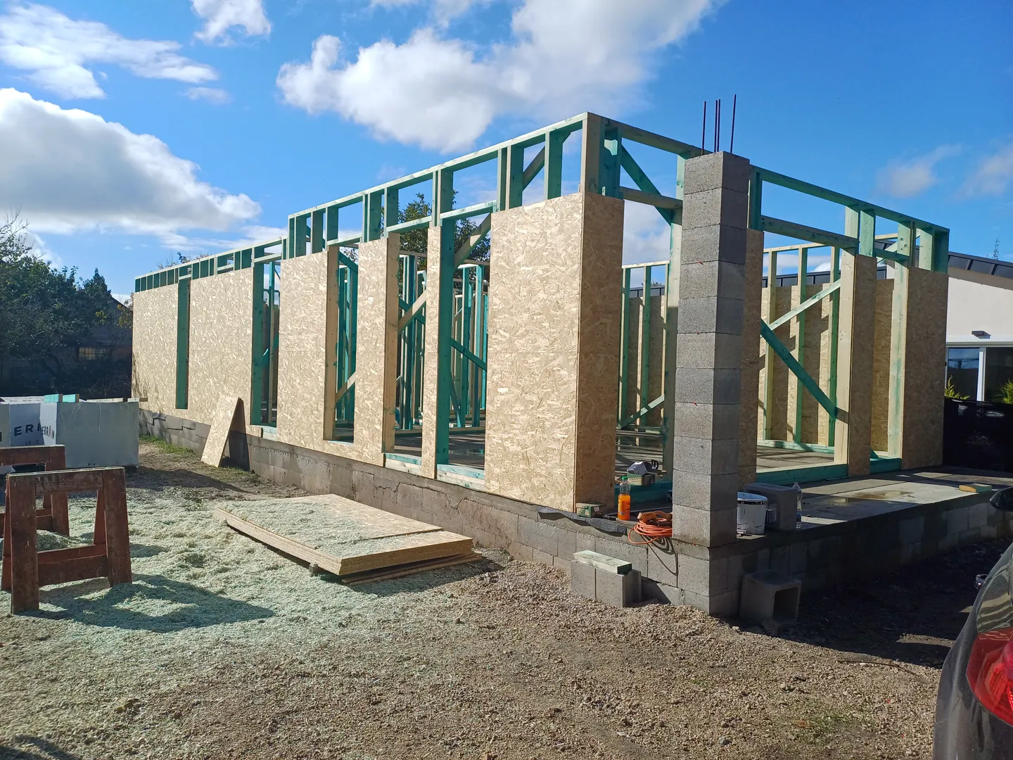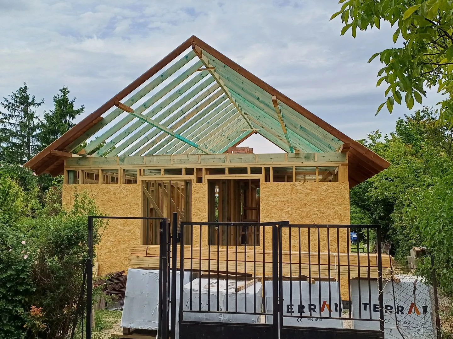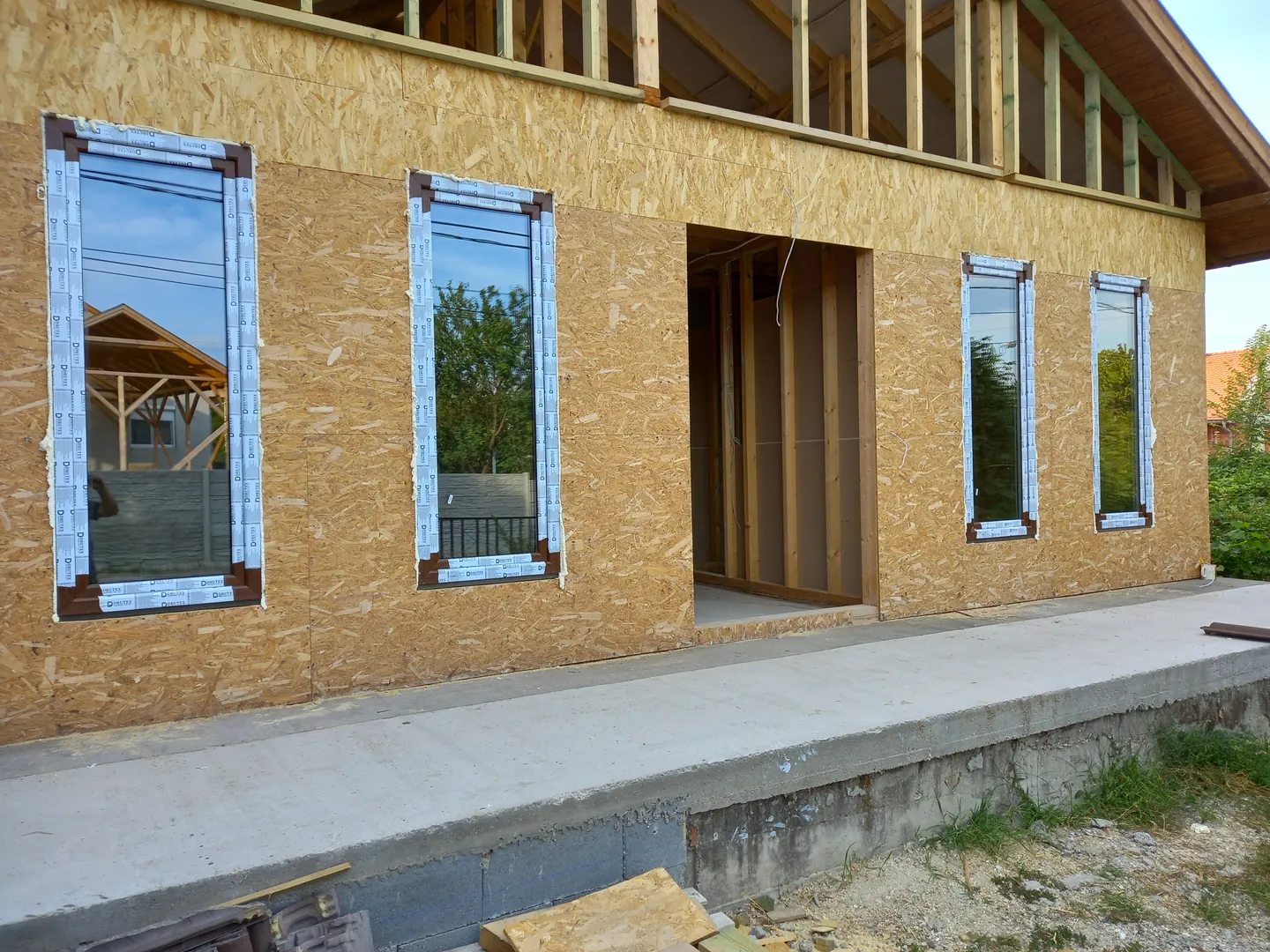 - Szerkezeti elemek gyártása: falpanelek összeszerelése a helyszínen , áthidalók födémszerkezet elkészítése , tetőszerkezet építése cserepezéssel . Homlokzati nyílászárók beszerelése
